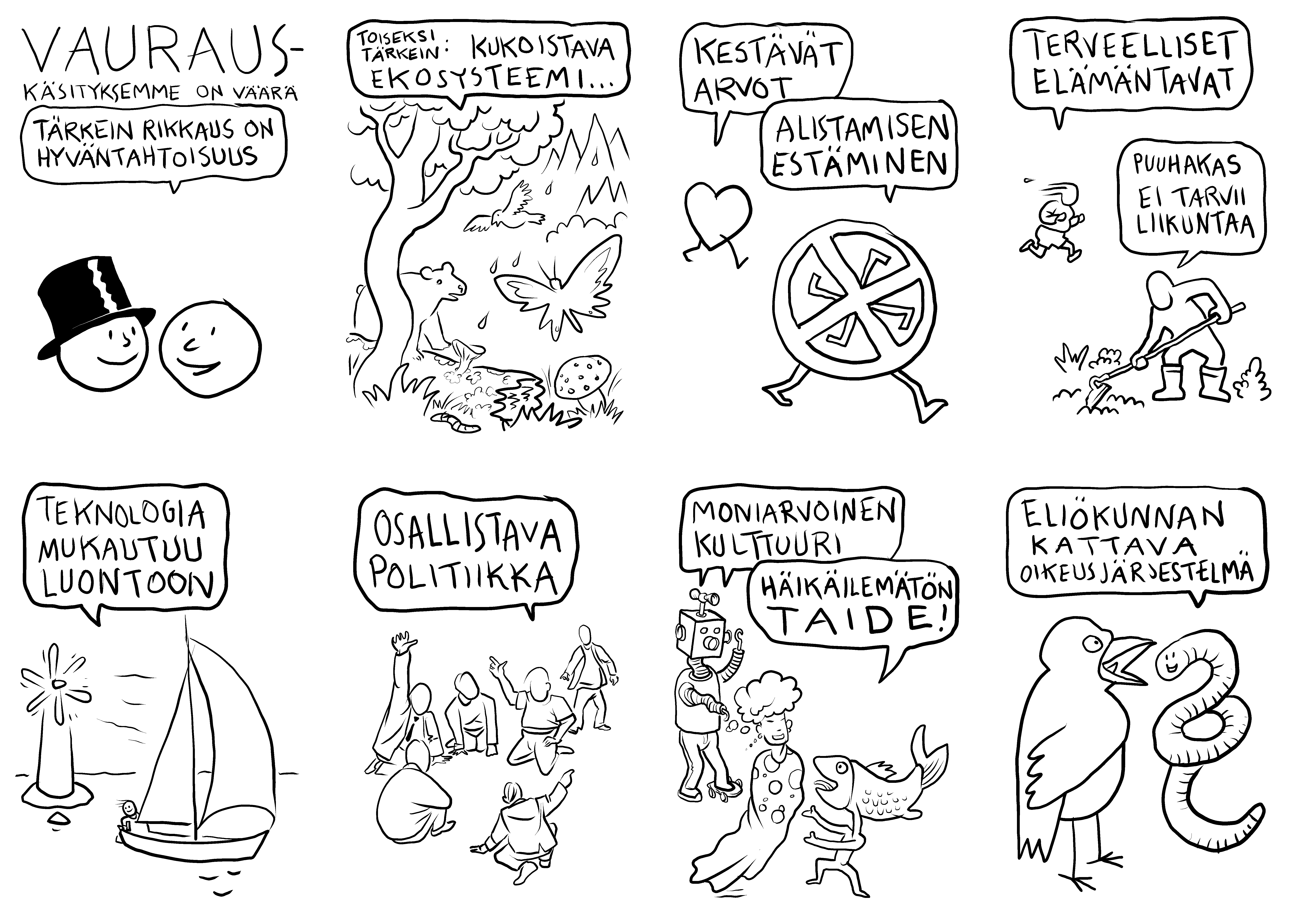 Sarjakuva sopii poliittiseen kannanottoon uskottavammin kuin mikään muu taide, paradoksaalisesti siksi, että siihen liittyy koomisen odotus. Sen hahmot ovat karikoituja ja tilanteet kärjistettyjä, joten sitä kautta todellisuuden ankaruus on välitettävissä lukijalle tehokkaammin kuin totisemmilla kerrontavälineillä. Mutta se vaatii myös perehtymistä. Pelkkä keljuuden raportointi ei riitä, pitää näyttää miten rakenteet sortavat ja miten yhteinen toiminta voisi korjata epäoikeudenmukaisuutta. No niin. Siinähän vaikeutta sitten riittää. Ehkä hyvien juttujen dokumentointi – utopian rakentaminen – olisi parasta systeemin vastustamista.